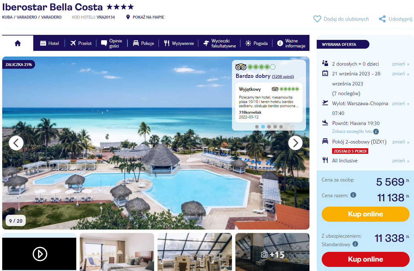 Urlop na Karaibach zaplanowany został w terminie 21 – 28 września. Czekają cię loty z Warszawy do Varadero, realizowane na pokładzie samolotów linii lotniczej SWISS. Po drodze zaplanowano bezpieczne, gwarantowane przez przewoźników przesiadki w Zurychu.