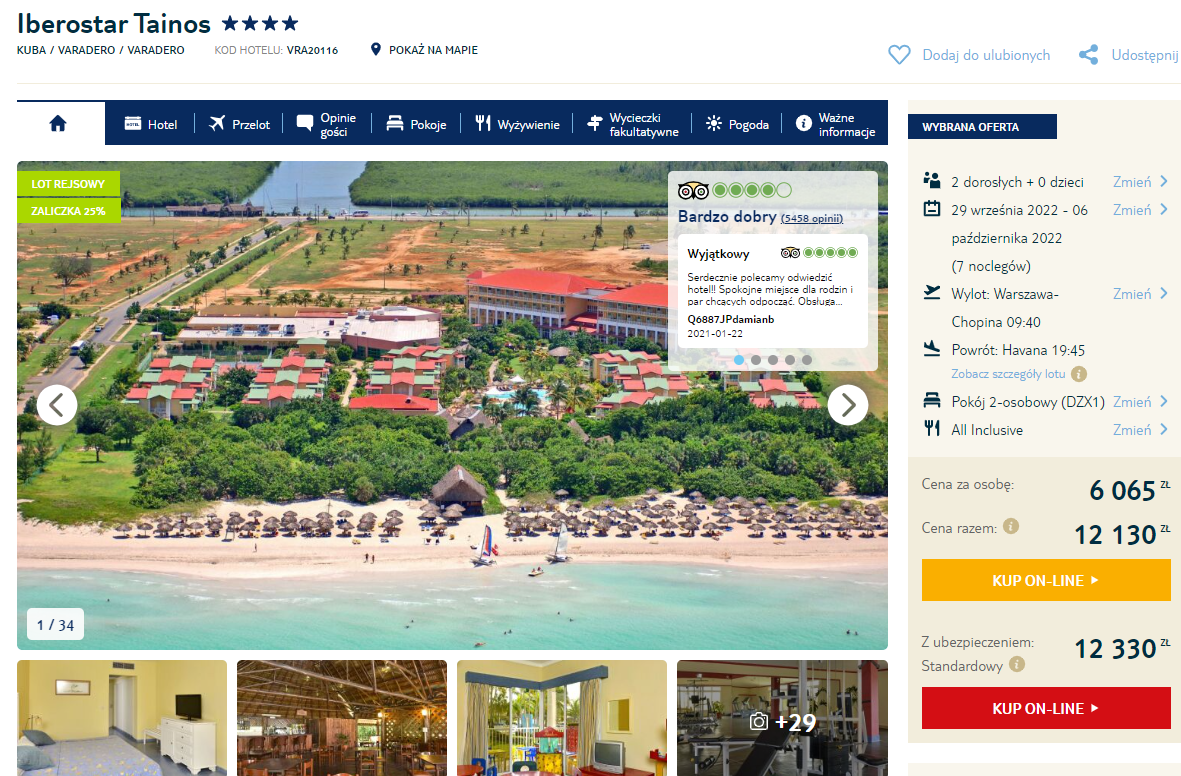 Na Karaiby udacie się w terminie 29 września – 6 października. Czeka was lot z Warszawy do Hawany, realizowany na pokładzie samolotów linii lotniczej Swiss Airlines. Po drodze zaplanowano bezpieczne, gwarantowane przez przewoźników przesiadki w Zurychu.