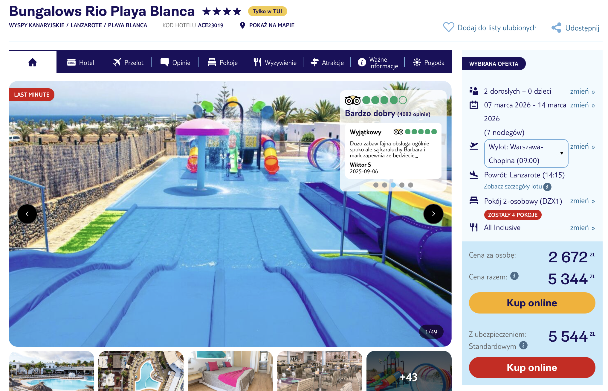 Na wyspie zatrzymasz się w Bungalows Rio Playa Blanca, który położony jest w południowej części Lanzarote, zaledwie 750 metrów od piaszczystej plaży. Goście chwalą obiekt za spokojną lokalizację, egzotyczny ogród oraz przyjazną atmosferę. Szczególnie rodziny z dziećmi doceniają basen ze zjeżdżalniami i plac zabaw. Hotel oferuje bogatą ofertę sportową – od boccia, przez łucznictwo, po tenis. Dwa razy w tygodniu organizowane są bufety tematyczne, w tym kanaryjski, dzięki czemu można poznać lokalne smaki.