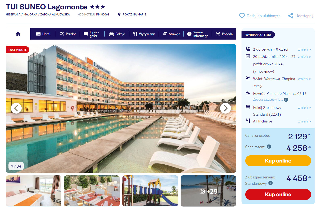 Na Majorce zatrzymasz się w 3* hotelu TUI SUNEO Lagomonte, który znajduje się w spokojnej części Alcudii, w odległości 10 minut spacerem od plaży. Na terenie obiektu mieszczą się dwa odkryte baseny, pokój oraz plac zabaw dla najmłodszych. Każdy pokój wyposażony jest w klimatyzację oraz telewizor LCD. W łazience jest prysznic, suszarka do włosów oraz podstawowe przybory toaletowe. Na terenie całego obiektu będziesz mieć zapewniony dostęp do sieci WiFi.