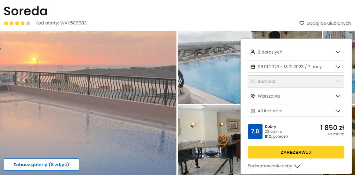 Na miejscu zatrzymasz się w 4* hotelu Soreda. Do dyspozycji gości będzie tam m.in. basen na dachu obiektu, kryty basen wewnątrz, restauracja serwująca dania w formule all inclusive oraz bar. Będzie to również świetna baza wypadowa do odkrywania uroków wyspy.