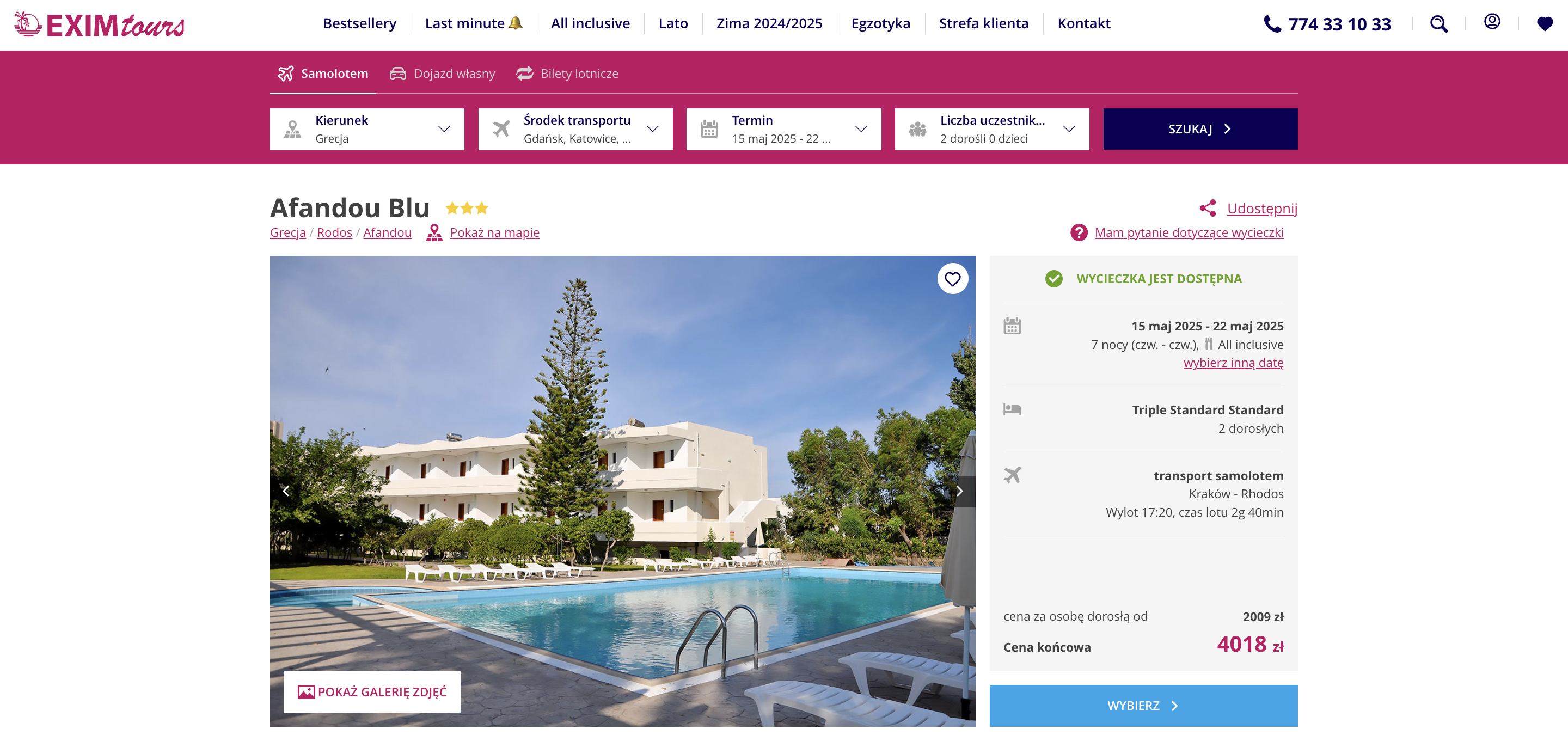 Do Grecji wybierzesz się w terminie 15-22 maja. Na Rodos polecisz linią Ryanair z lotniska w Krakowie. W cenę pakietu wliczone są transfery na trasie lotnisko – hotel – lotnisko, all inclusive i podstawowe ubezpieczenie.