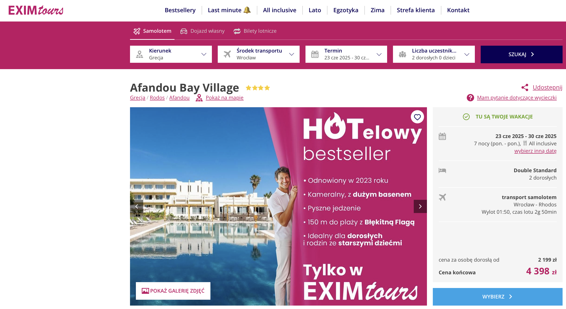 W cenie otrzymujesz przelot w obie strony, zakwaterowanie w 4* hotelu, all inclusive obejmujące trzy posiłki dziennie oraz przekąski i napoje w ciągu dnia. Pakiet zawiera również podstawowe ubezpieczenie turystyczne. Hotel położony jest około 1,5 km od centrum Afandou i 18 km od miasta Rodos.