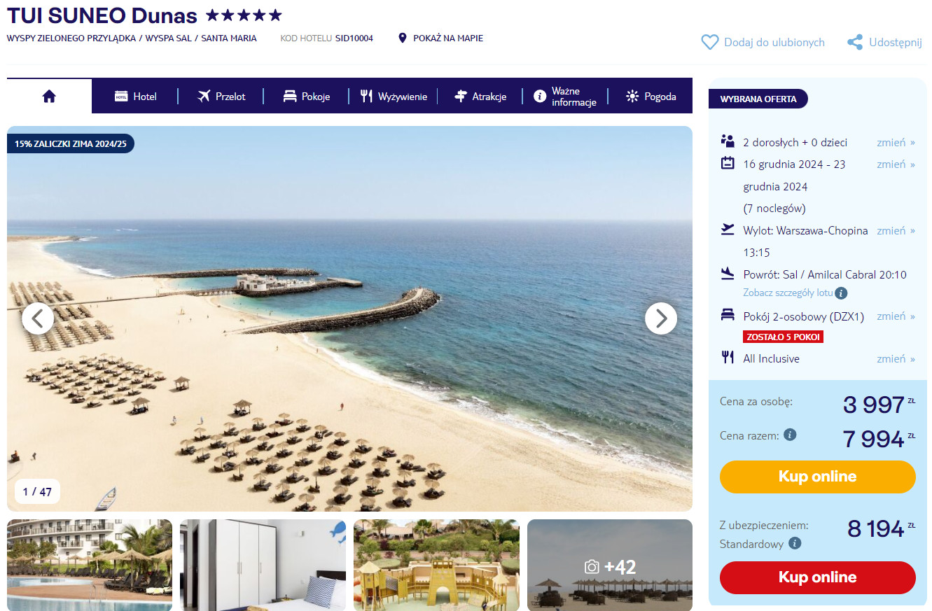 Urlop spędzisz w bardzo dobrym 5* hotelu TUI SUNEO Dunas, który znajduje się przy plaży (leżaki, parasole oraz bar all inclusive w cenie) z wydzieloną strefą dla gości hotelowych. Na terenie obiektu mieszczą się cztery baseny, wodny plac zabaw dla dzieci oraz aquapark „WATERPARK”. Każdy pokój jest wyposażony w klimatyzację, telewizor oraz lodówkę i WiFi. W łazience jest prysznic oraz podstawowe przybory toaletowe.