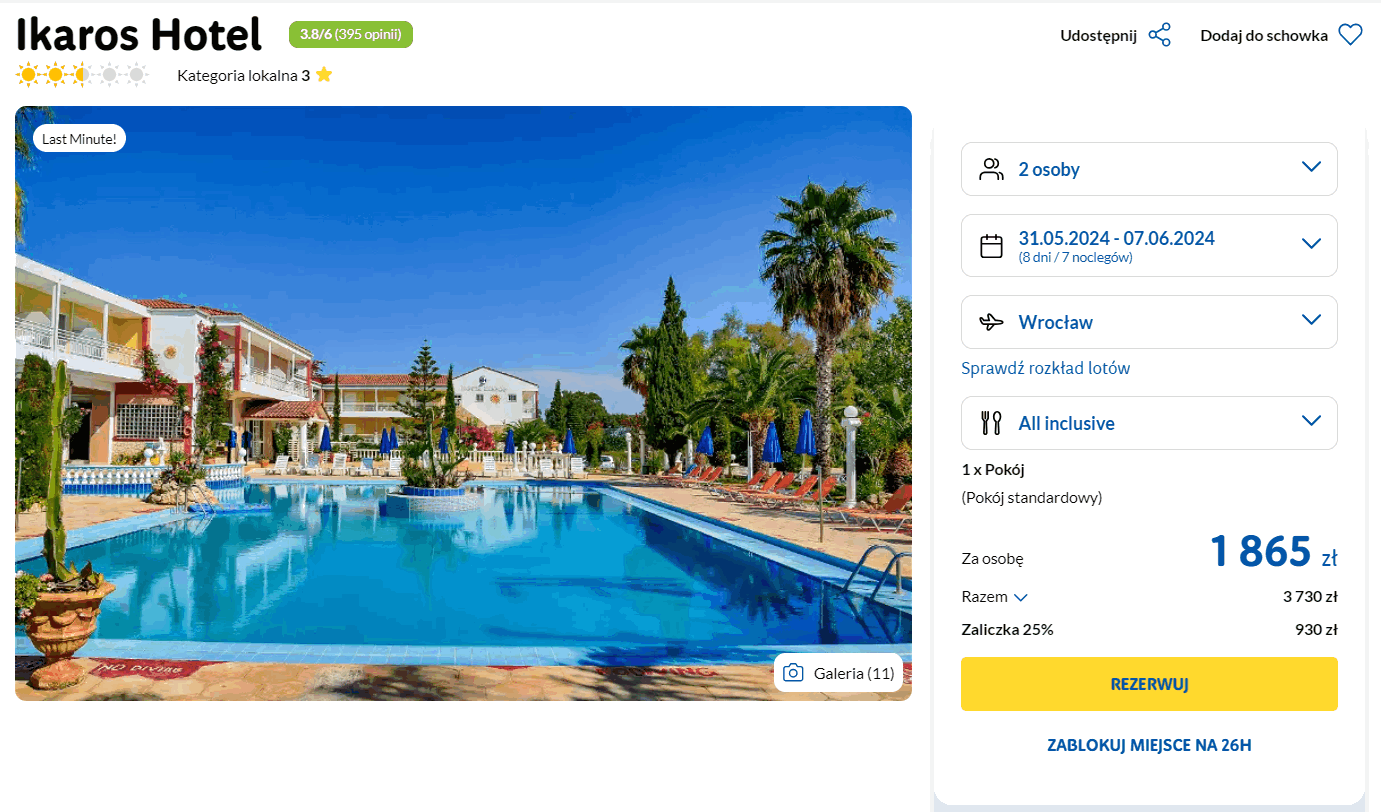 Na greckiej wyspie zatrzymasz się w hotelu Ikaros, który znajduje się nad zatoką Laganas. Na terenie obiektu mieści się odkryty basen z wydzieloną strefą dla najmłodszych. Każdy pokój został wyposażony w klimatyzację oraz telewizor LCD. W łazience jest wanna. Dla gości przygotowano podstawowe przybory toaletowe. Na terenie całego hotelu będziesz miał zapewniony dostęp do sieci WiFi.