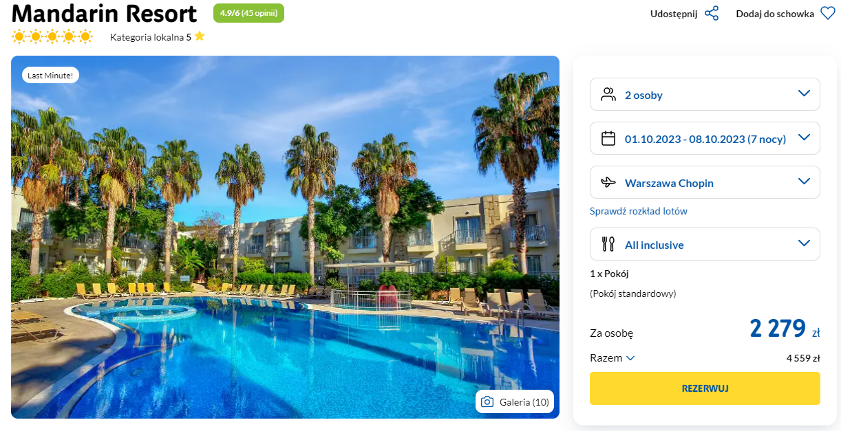 Urlop spędzisz w 5* hotelu Mandarin Resort. Kompleks znajduje się 400 metrów od piaszczystej plaży. Na miejscu będzie okazja skorzystać z odkrytego basenu, tarasu słonecznego, programu animacyjnego, sauny i strefy fitness. W cenę pakietu wliczono wyżywienie w formule all inclusive, transfery na trasie lotnisko – hotel – lotnisko, opiekę rezydenta oraz podstawowe ubezpieczenie.