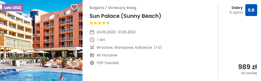 Na wypoczynek udacie się w terminie 24–31 maja. Do Burgas polecicie bezpośrednio z wliczonym bagażem rejestrowanym z Krakowa lub Warszawy. Na miejscu będziecie zakwaterowani w 4* hotelu Sun Palace. Będziecie mogli skorzystać z basenów i komfortowego wyżywienia all inclusive. Obiekt posiada dobre opinie dotychczasowych gości. Co więcej, piaszczysta plaża znajduje się około 200 metrów od ośrodka.