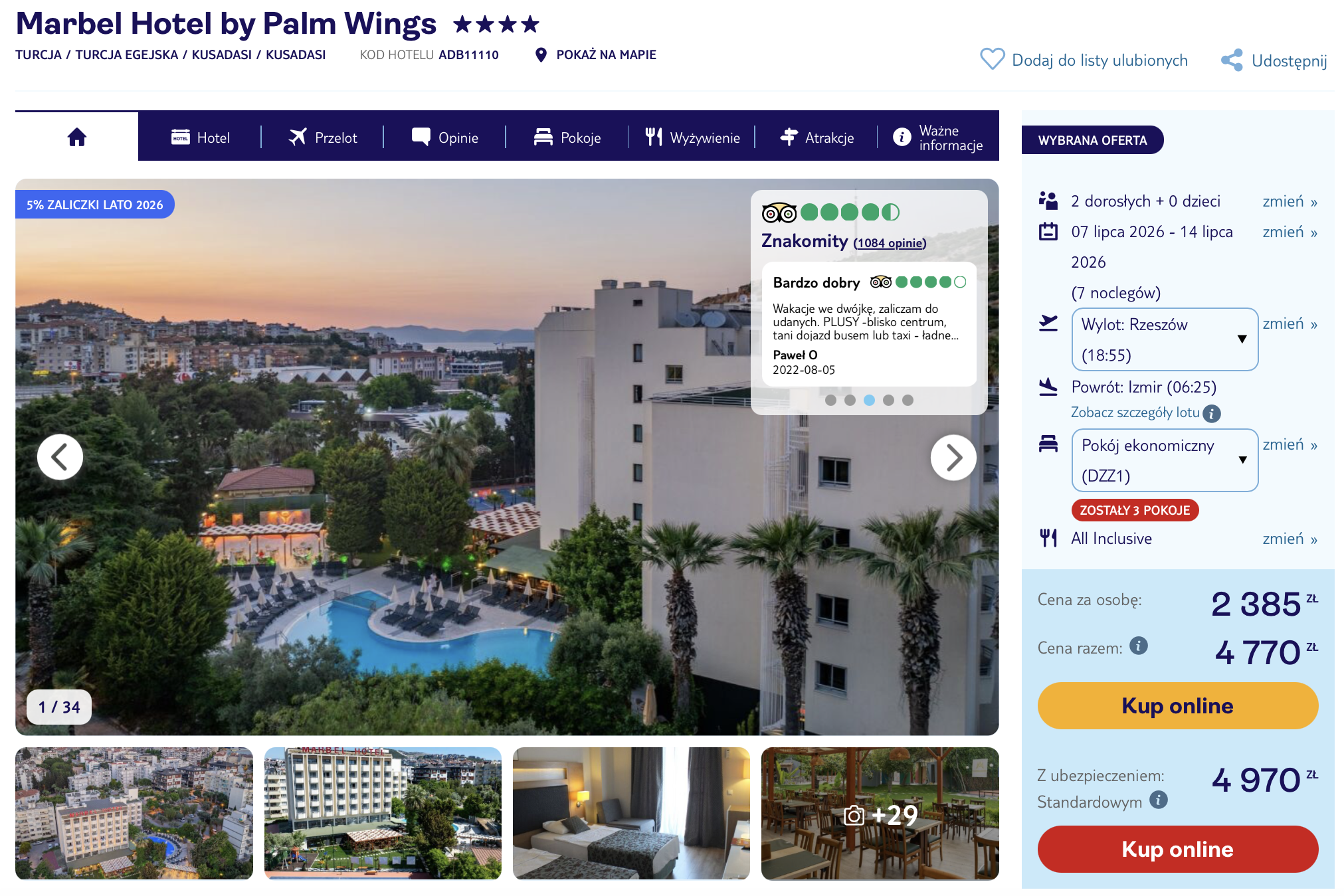W Kusadasi zatrzymasz się w 4* Marbel Hotel by Palm Wings. Goście chwalą komfortowe pokoje, dobrą kuchnię oraz miłą obsługę. Hotel dysponuje basenem, strefą spa z sauną i hammamem oraz oferuje masaże. Dla aktywnych dostępne są korty tenisowe oraz tenis stołowy. Obiekt znajduje się ok. 2,5 km od plaży, a do centrum Kusadasi jest ok. 1,7 km. W okolicy warto odwiedzić starożytne miasto Efez, zamek na wyspie Güvercinada czy plażę Ladies Beach.