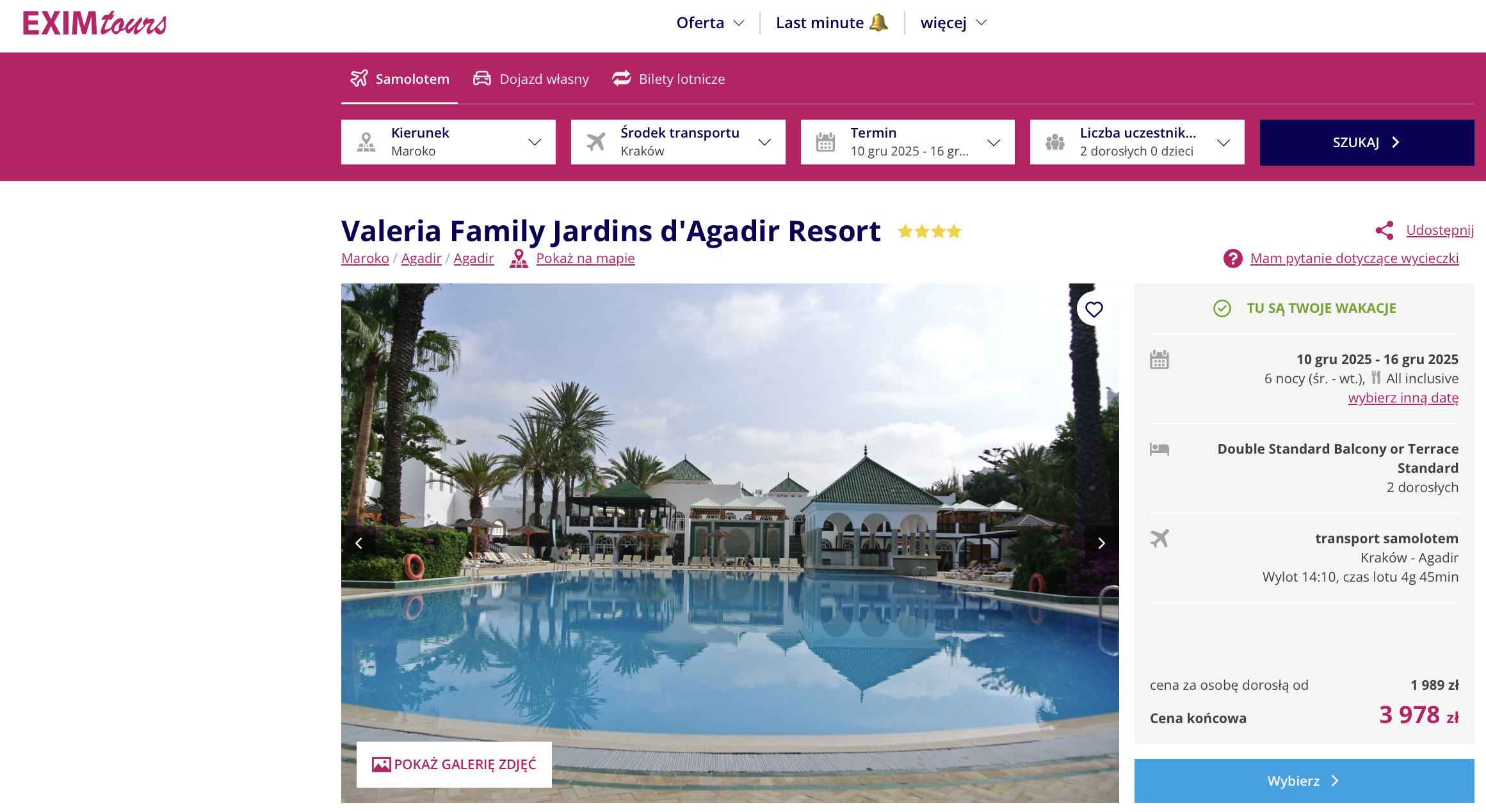 Do Agadiru polecisz z Warszawy, Katowic, Krakowa lub Wrocławia w grudniu. W cenie podstawowej masz bagaż podręczny (wymiary 40x30x20 cm), a większy bagaż możesz dokupić według potrzeb.