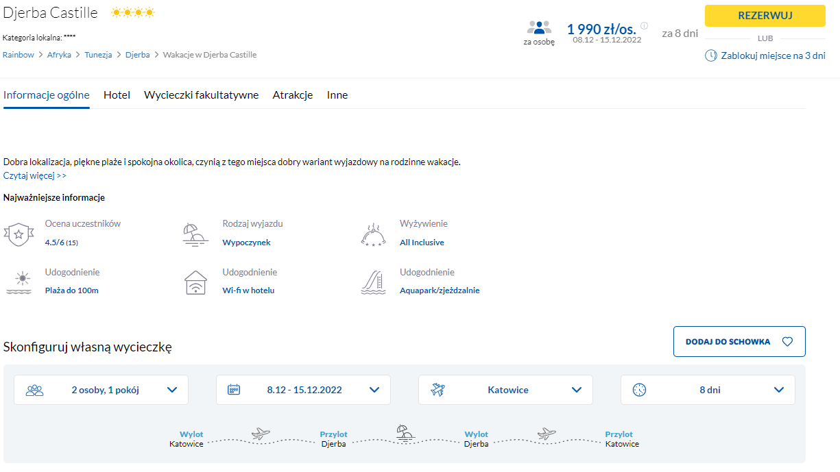 Do Afryki udacie się w terminie 8 – 15 grudnia. Do Djerby polecicie bezpośrednio z Katowic lub Warszawy, a w cenę pakietu wliczono bagaż rejestrowany (nadawany do luku).