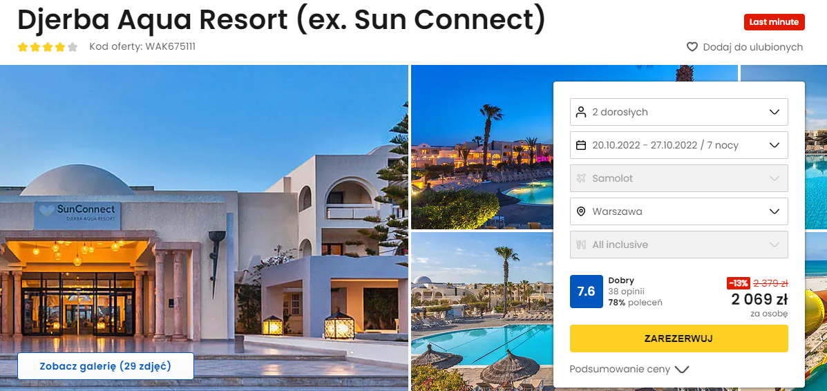 Urlop w Tunezji zaplanowany został w terminie 20 – 27 października. Czeka cię bezpośredni lot na Djerbę, a jako miejsce wylotu wybrać możesz Warszawę lub Katowice. W cenę pakietu wliczono podróż z bagażem rejestrowanym (nadawanym do luku).
