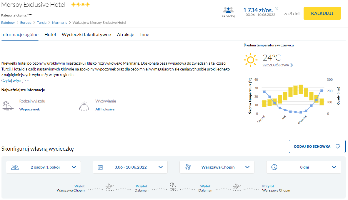 W podróż do Turcji wybierzecie się w terminie 3-10.06. Na początek czeka was lot z Warszawy do Dalaman, realizowany na pokładzie samolotu linii lotniczej Smartwings. Tym razem nie będzie problemu z pakowaniem się: w cenę pakietu wliczono również bagaż rejestrowany.