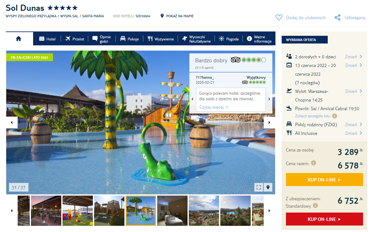 Na wyspie będziecie zakwaterowani w luksusowym 5* hotelu Sol Dunas. Do waszej dyspozycji będą tam komfortowo urządzone pokoje z prywatną łazienką, telewizorem LCD oraz klimatyzacją. Na terenie kompleksu działa kilka basenów wraz z barami, specjalny basen ze zjeżdżalniami oraz 3 restauracje serwujące specjały międzynarodowej kuchni – a to wszystko oczywiście w formule all inclusive.