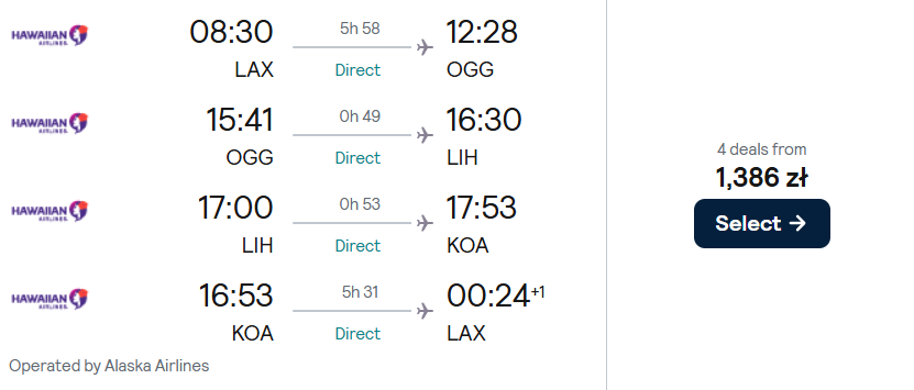 Ta niezwykła podróż do Stanów Zjednoczonych składa się z dwóch niezależnych rezerwacji lotów na trasach: Warszawa – Los Angeles – Warszawa oraz Los Angeles – Maui – Kaua’i – Haawa’i – Los Angeles.