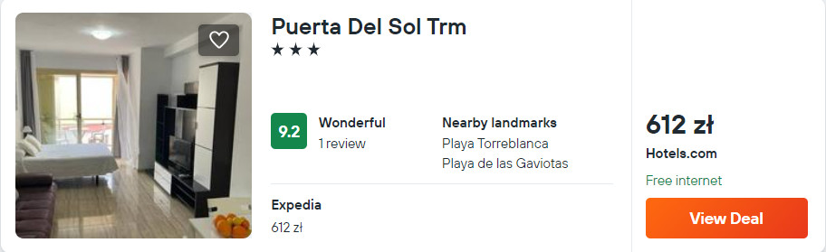 W Hiszpanii zatrzymasz się w 3* hotelu Puerta Del Sol Trm, który znajduje się w miejscowości Torremolinos. Z lotniska w okolice miejsca noclegowego (stacja Torremolinos) dojedziesz pociągiem C1 lub wypożyczonym samochodem – szczegóły poniżej.