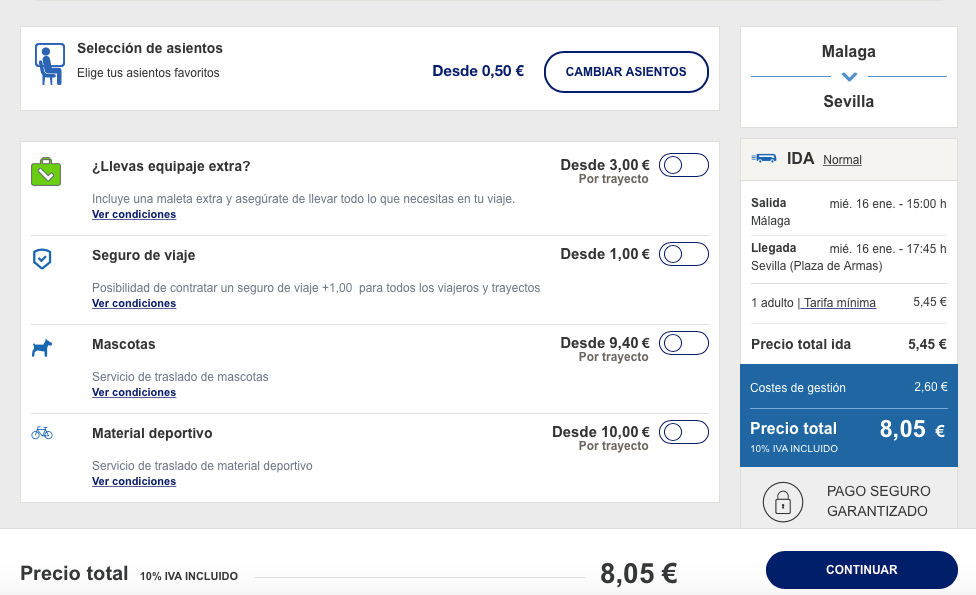 Alsa| Malaga – Sewilla | kilka przejazdów dziennie | 8 EUR ok. 34 PLN | 13, 14, 15, 16, 17 stycznia