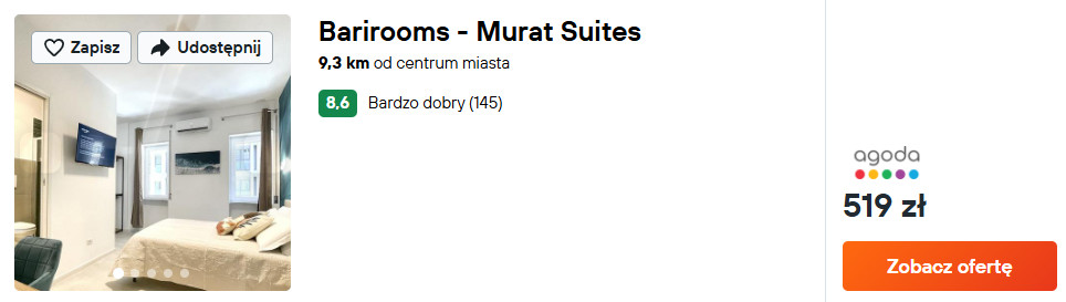 Barirooms – Murat Suites to kameralny obiekt w samym sercu Bari, zaledwie kilka minut pieszo od dworca i głównych atrakcji miasta. Oferuje nowoczesne pokoje z klimatyzacją, prywatną łazienką i bezpłatnym WiFi. Goście chwalą czystość, lokalizację i włoskie śniadanie. Idealny wybór na krótki pobyt w centrum.