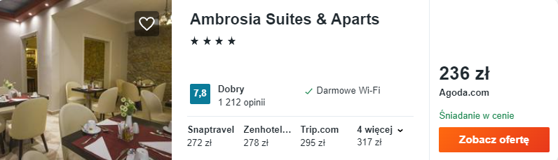 Wybrałem dla was zakwaterowanie w 4* Ambrosia Suites & Aparts. Ten klimatyczny aparthotel pozwoli od razu poczuć grecki klimat. Na dobry początek dnia otrzymacie śniadania wliczone w cenę noclegów.