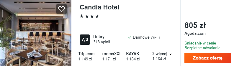 Wybrałem dla was noclegi w 4* hotelu Candia. Obiekt wyróżnia się m.in. tarasem z basenem na dachu, z którego roztacza się wspaniała panorama okolicy. W cenę zakwaterowania wliczono codzienne śniadania.
