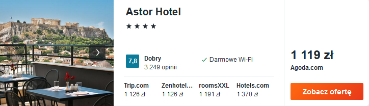 Wybrałem dla was zakwaterowanie w eleganckim 4* hotelu Astor. Jego głównym atutem są wspaniałe widoki – z okien oraz tarasu na dachu będziecie mogli podziwiać wspaniałą panoramę Akropolu – przekonajcie się sami, jak wspaniale prezentuje się on wieczorem!