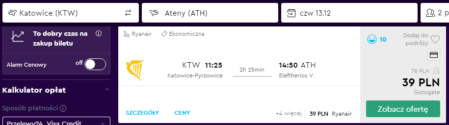 Loty z Katowic do Aten (13-16 grudnia) za 164 PLN / 2 osoby (82 PLN / osoba)
