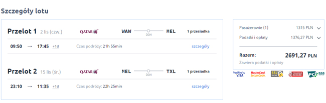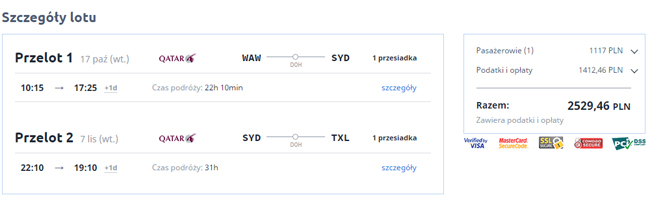 Przeloty na pokładzie 5* linii Qatar Airways. W podróż zabierzecie ze sobą bagaż podręczny i rejestrowany, a lecąc do Australii czeka Was przesiadka na lotnisku w Doha.
