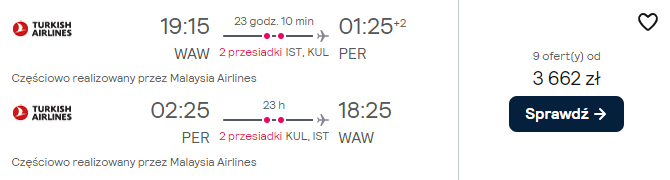 Do Australii polecisz np. w terminie 29 października – 17 listopada. Czeka cię podróż do Perth liniami Turkish Airlines oraz Malaysia Airlines z krótkimi przesiadkami w Stambule i Kuala Lumpur.