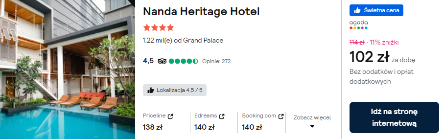 Na początek czeka cię jedna noc w Bangkoku. Zatrzymaj się tam w bardzo dobrze ocenianym 4* hotelu Nanda Heritage. Będzie to świetna baza wypadowa na szybkie zwiedzanie.