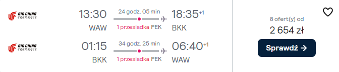 Zacznij od rezerwacji dalekich lotów, czyli podróży z Warszawy do Bangkoku. Do Tajlandii polecisz z Warszawy linią Air China z przesiadkami w Pekinie. Dłuższy transfer możesz wykorzystać na szybkie zwiedzenie miasta lub wycieczkę na Wielki Mur (więcej szczegółów tutaj).
