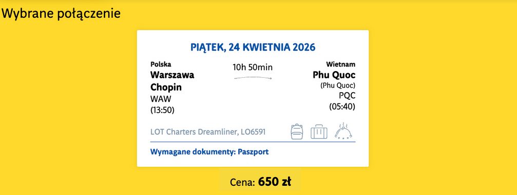 Na wyspę Phu Quoc polecisz z Warszawy Boeingiem 787 „Dreamliner”, należącym do PLL LOT. W cenie możesz zabrać bagaż rejestrowany (nadawany do luku) oraz bagaż podręczny.