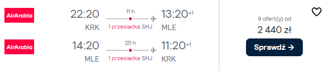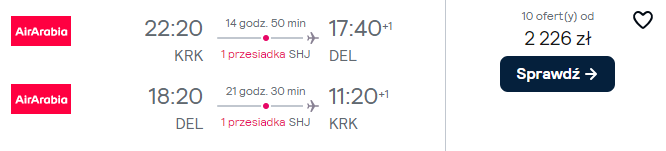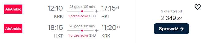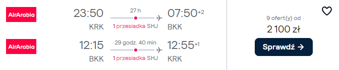 Poniżej znajdziesz zestawienie najciekawszych propozycji lotów do Azji. Wybierzesz się tam z Krakowa linią Air Arabia. Po drodze zaplanowana jest przesiadka w Szardży (w niektórych przypadkach z nocą w ZEA).