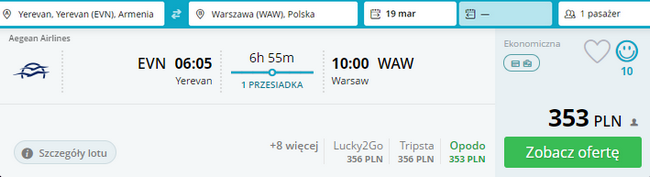 Aegean Airlines | Erywań 06:05 – Warszawa 10:00 | 353 PLN | 19 marca