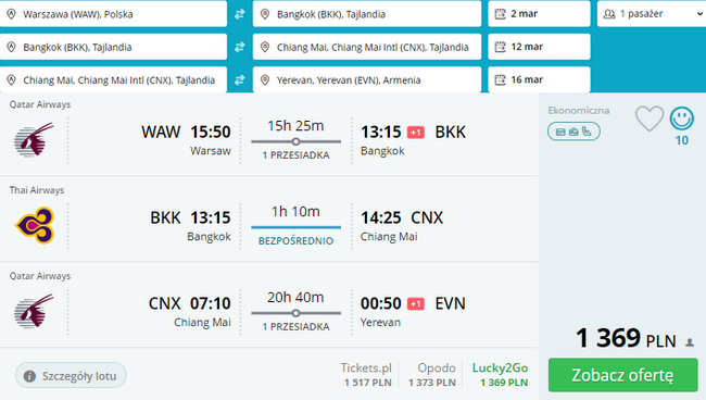 Qatar Airways | Warszawa 15:50 – Bangkok 13:15 | 1369 PLN | 2 (3) marca