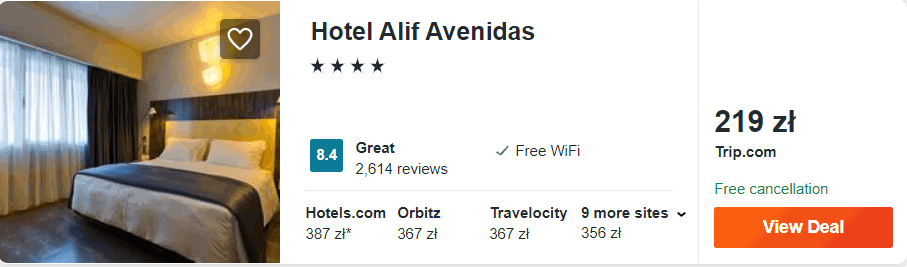 W Lizbonie zatrzymajcie się w 4* hotelu Alif Avenidas, który znajduje się nieopodal parku Eduardo VII. Wszystkie pokoje wyposażone zostały w klimatyzację, telewizor LCD oraz czajnik elektryczny. W każdym jest łazienka z wanną i prysznicem oraz suszarką do włosów.