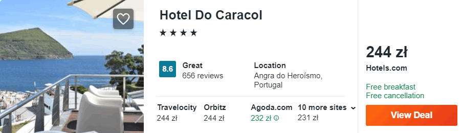 Natomiast na wyspie Terceira rekomenduję wam noclegi z codziennymi śniadaniami w 4* hotelu Do Caracol. W hotelu możecie liczyć na wiele udogodnień, do których zaliczyć należy bezpłatny dostęp do sieci WiFi, odkryty basen oraz drewniany taras, z którego rozpościera się panoramiczny widok na Ocean Atlantycki.