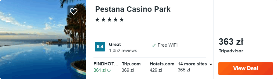 Natomiast w Funchal rekomenduję wam pobyt w 4* Pestana Casino Park. Wszystkie hotelowe pokoje składają się z części wypoczynkowej, miejsca do spania, łazienki oraz balkonu, z którego rozpościera się malowniczy widok na zatokę Funchal.
