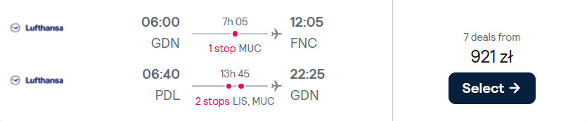 Na wycieczkę (Azory+Madera) wybrać możesz się z Gdańska, Poznania lub Rzeszowa. Do i z Portugalii polecisz linią Lufthansa z przesiadkami w Monachium i Lizbonie. Natomiast pomiędzy wyspami podróżować będziesz linią SATA Air Açores.