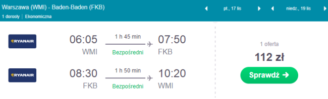 Wszystko super, tylko jak się tam dostać? Odpowiedź jest prosta. Już od 29 października Ryanair uruchamia nowe bezpośrednie połączenie lotnicze pomiędzy lotniskiem Warszawa-Modlin a Karlsruhe/Baden-Baden. Przewoźnik będzie latał dwa razy w tygodniu – w piątek oraz w niedzielę. Przelot potrwa niecałe 2 godziny. Doskonała okazja na weekendowy wypad!