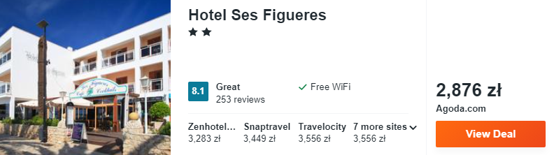 Na Balearach wybrałem dla was zakwaterowanie w 2* hotelu Ses Figueres. Do waszej dyspozycji będą tam klimatyzowane pokoje, wyposażone m.in. w prywatną w łazienkę, telewizor LCD, sejf oraz minibar.