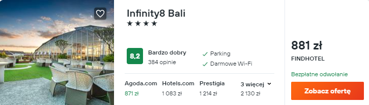 Wybrałem dla was noclegi w bardzo dobrym 4* hotelu Infinity8 Bali. Główną atrakcją będzie basen bez krawędzi znajdujący się na dachu budynku, z którego będziecie mieli wspaniały widok na okolicę. Dla gości przygotowano stylowe, designersko urządzone pokoje oraz elegancki bar.