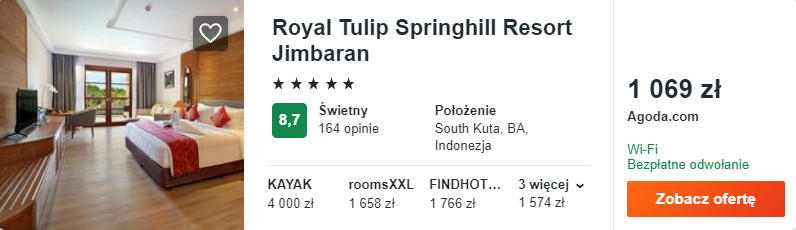 Na Bali zatrzymajcie się w świetnym 5* hotelu Royal Tulip Springhill Resort Jimbaran. To luksusowy obiekt wypoczynkowy, który poza zakwaterowaniem w elegancko urządzonych pokojach oferuje gościom 2 baseny, centrum fitness oraz elegancki bar.