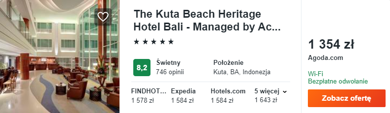 Na Bali zatrzymajcie się w bardzo dobrym 5* The Kuta Beach Heritage Hotel. Czekają tam na was komfortowo wyposażone, klimatyzowane pokoje, odkryty basen oraz wspaniałe widoki na morze.