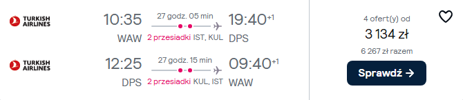 Do Indonezji udasz się w terminie 7(8) – 22(23) czerwca. Na Bali polecisz z Warszawy z Turkish Airlines. Po drodze przesiądziesz się Stambule oraz Kuala Lumpur.