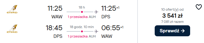 Do Indonezji polecisz w terminie obejmującym przyszłoroczną majówkę, 26(27) kwietnia – 5(6) maja. Czeka cię podróż z Warszawy na Bali z Etihad Airways. Po drodze przesiądziesz się w Abu Zabi.