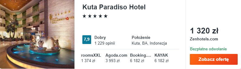 Na Bali spędzicie 8 nocy. Wybrałem dla was zakwaterowanie w 5* Kuta Paradiso Hotel. Na miejscu do waszej dyspozycji będą przestronnie urządzone, eleganckie pokoje, a także odkryty basen oraz restauracja.