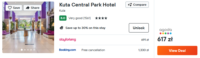 Zatrzymaj się w bardzo dobrze ocenianym 4* hotelu Kuta Central Park. Wysoki komfort, atrakcyjna lokalizacja i niska cena sprawiają, że będzie to świetny wybór na bazę wypadową w trakcie wycieczki.