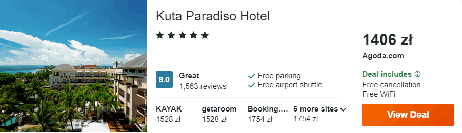 Do propozycji lotów dołączam noclegi w 5* Kuta Paradiso Hotel – nowoczesny design, funkcjonalnie urządzone pokoje oraz sporych rozmiarów kompleks basenowy z pewnością pomogą w przejściu do „stanu relaksu” 😉 Jedynie 150 metrów będzie was dzieliło od popularnej plaży Kuta Beach.