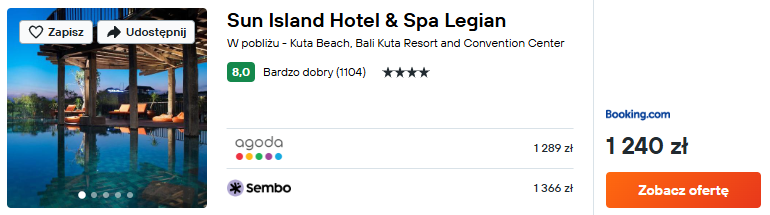 Wybrałem noclegi w bardzo dobrze ocenianym 4* hotelu Sun Island Hotel & Spa Legian. Będzie to doskonały wybór na dłuższy pobyt i świetna baza wypadowa w trakcie wycieczki. Najlepsza część? Odkryty basen z pięknym widokiem.