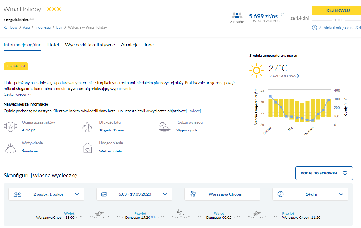 Na wyspę bogów udasz się w terminie 6 – 19 marca. Czekają cię loty na pokładzie samolotów świetnej linii lotniczej Emirates z bezpiecznymi, gwarantowanymi przez przewoźnika przesiadkami w Dubaju. W cenę pakietu wliczono bagaż rejestrowany (nadawany do luku).