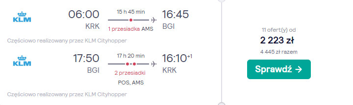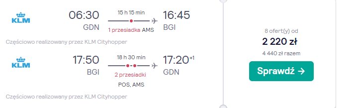 W podróż na Karaiby udacie się w terminie 3 – 10 marca. Do wyboru macie wyloty z Gdańska, Krakowa oraz Warszawy. Do Bridgetown polecicie na pokładzie samolotów linii lotniczej KLM z bezpiecznymi przesiadkami w Amsterdamie.